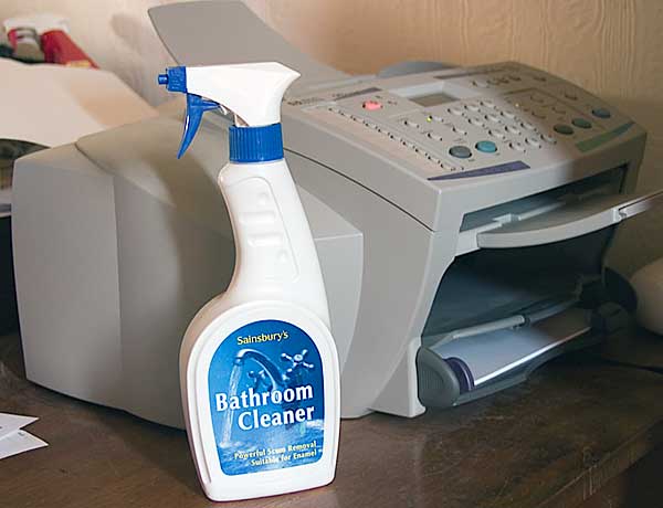 Next, takes some window cleaner (e.g. Windex) and spray it on a piece of paper towel, then clean the ribbon that sits behind the ink cartridge tray. The ribbon is typically white in color.